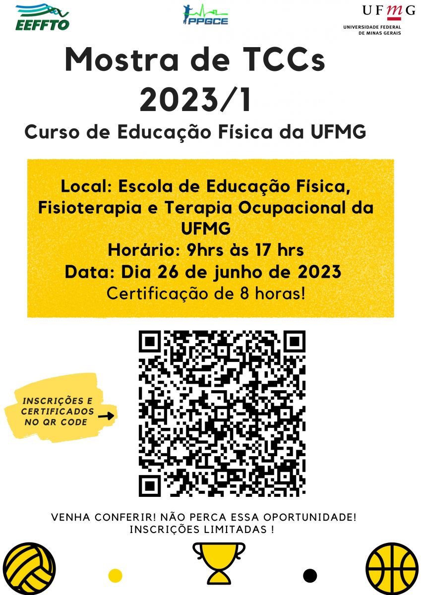 Na próxima segunda-feira(26), a Escola de Educação Física, Fisioterapia e Terapia Ocupacional (EEFFTO), da UFMG, recebe a Mostra de TCC dos estudantes de Educação Física da Universidade. O evento será realizado nas salas da Unidade, das 9h às 17h.