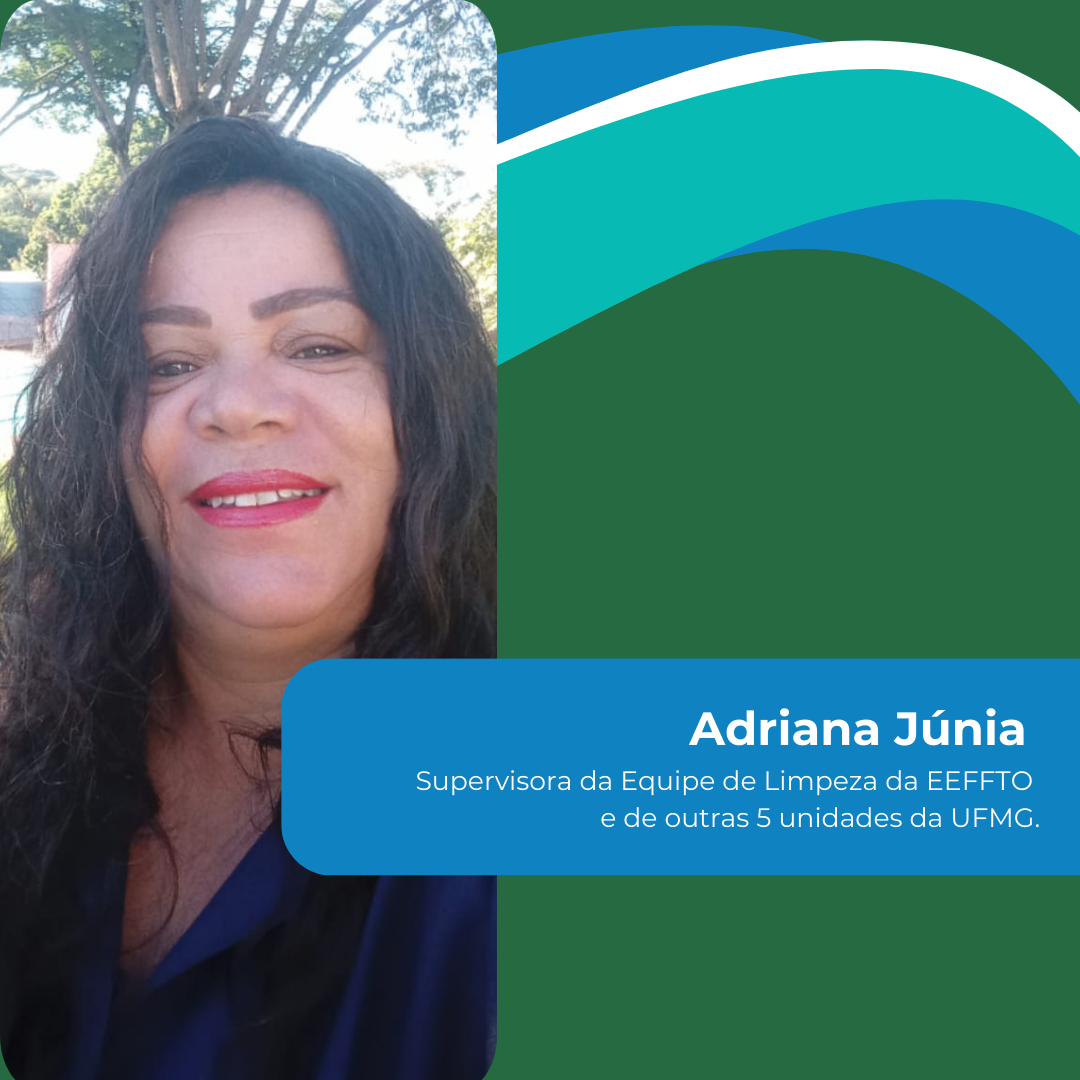 Adriana Júnia é supervisora da equipe de limpeza da EEFFTO e de outras 5 unidades da UFMG. Sai de casa todo dia às 5h da manhã para coordenar as equipes que cuidam do nosso prédio. Ela conta que seu desafio diário é lidar e gerir pessoas. Sua equipe conta com 50 mulheres, que ela coordena com muita dedicação e respeito, sempre em busca de entender as individualidades de cada uma. Viúva, ela criou seus 2 filhos ao lado do marido. Mas hoje, segue a vida sozinha, em busca de alcançar seus objetivos.
