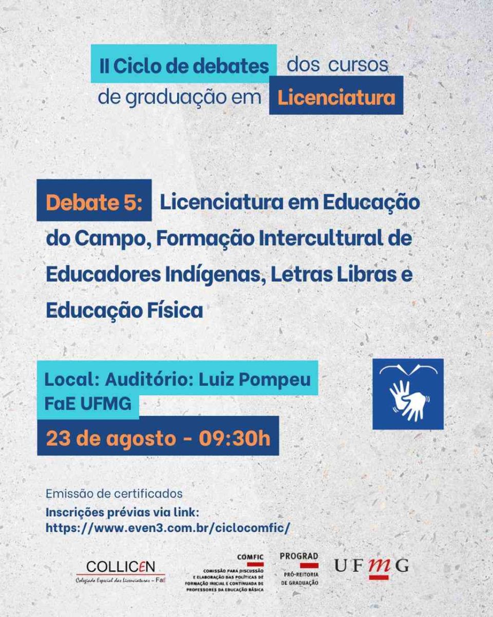 Neste último encontro do Ciclo de Debates é a vez dos cursos de licenciatura em Educação do campo, Letras Libras, Formação Intercultural de Educadores Indígenas e Educação Física se apresentarem. O encontro é norteado pelo tema: “A identidade própria dos cursos de licenciatura”. A ideia é construir um diagnóstico e uma proposta institucional para a formação inicial de professores da Educação Básica, algumas perguntas nortearão nossos encontros: Qual formação realizamos em nossos cursos de licenciatura? Qual formação inicial de professoras e professores da educação básica queremos promover?